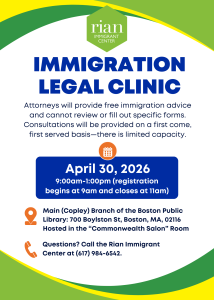 Rian hosts free legal clinics at Boston Public Libraries. Clinics are first come/first served. Lawyers will provide comprehensive, tailored immigration advice and if you have a case we can assist you with, you’ll be referred to Rian for representation. Please call the legal team at 617-984-6542 for more information, or if you’d like to complete an intake form in advance of the clinic.